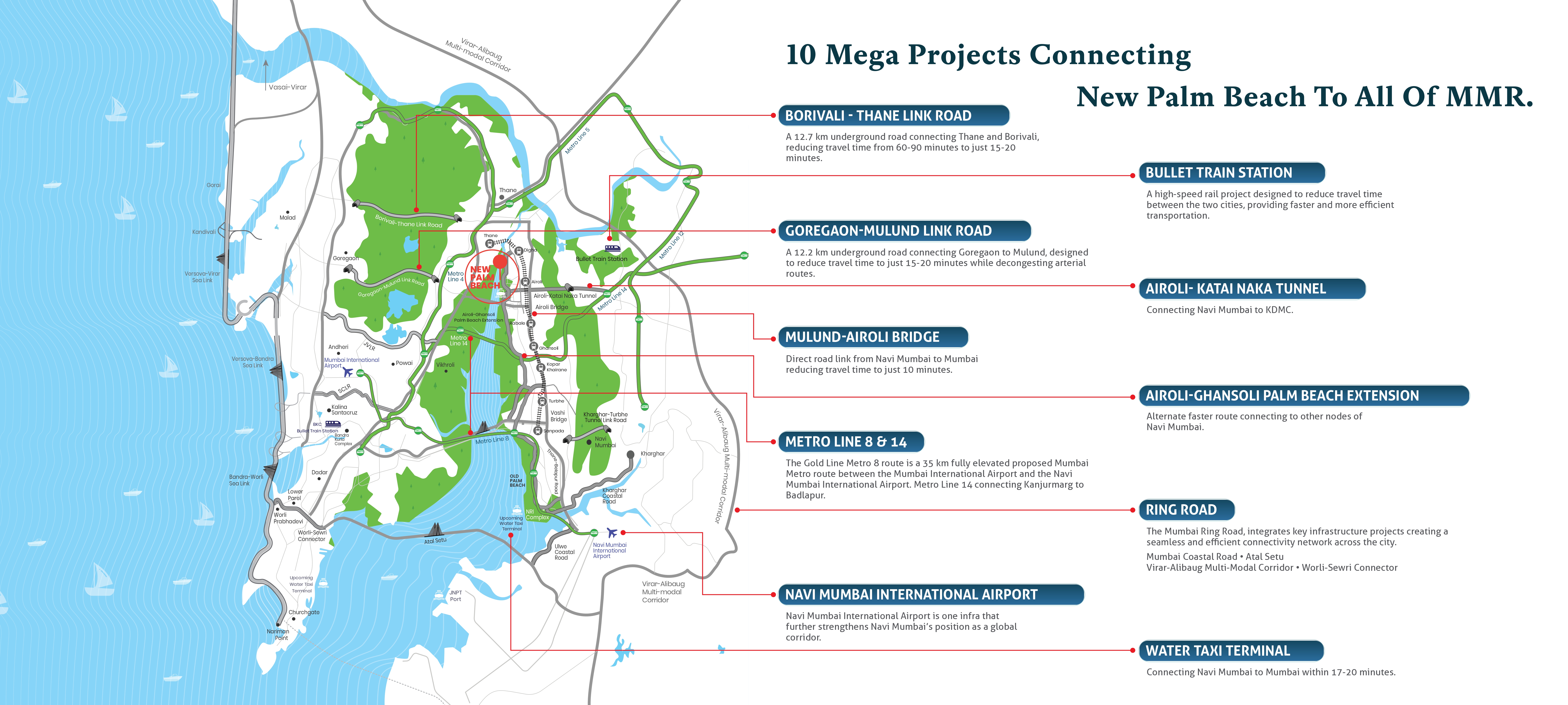 Located at the heart of MMR, New Palm Beach is surrounded by multiple infrastructure projects ensuring easy access to all key regions within an hour.